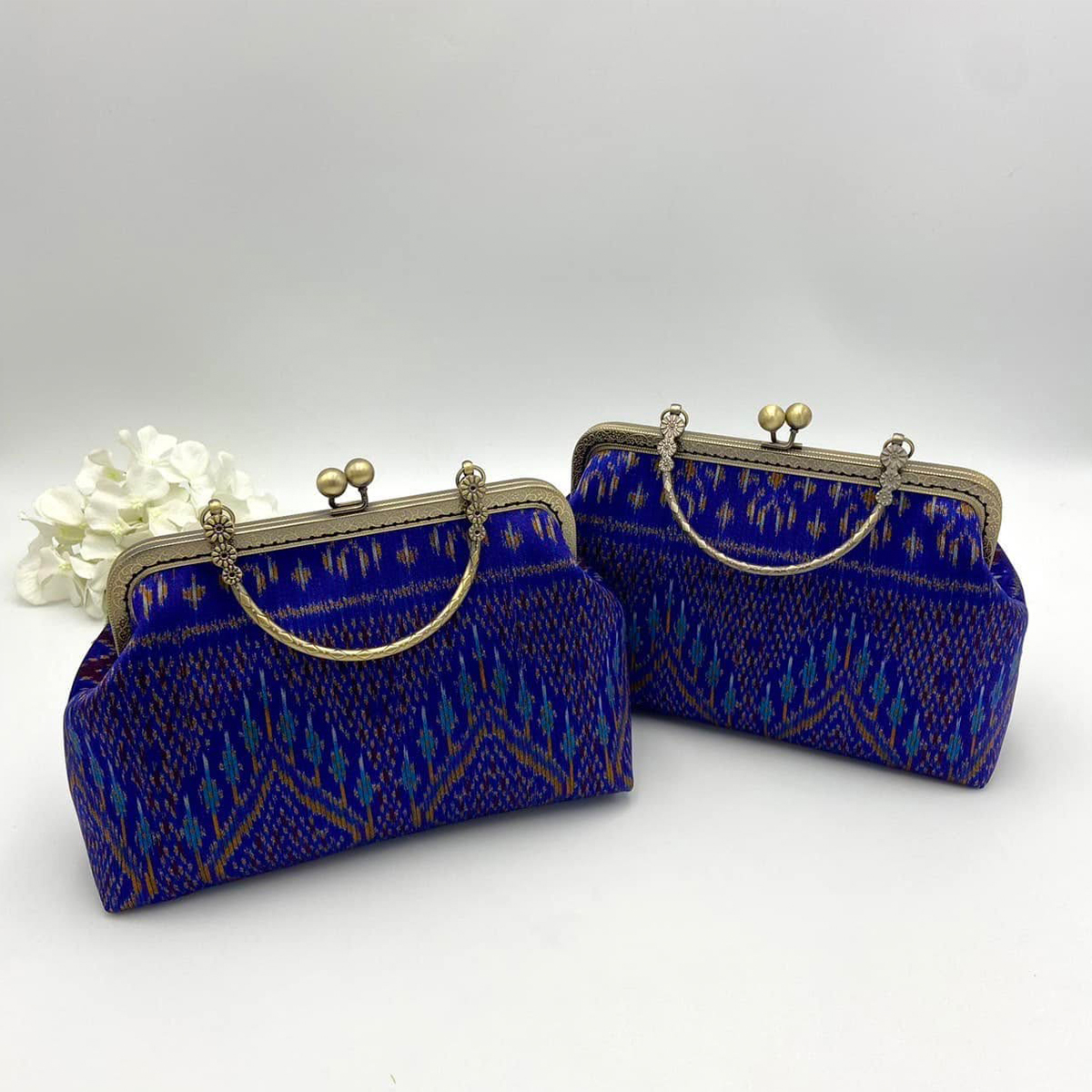 กระเป๋าผ้าไหมลายสก๊อกสีส้มอ่อน รุ่นใบกลางหูดอกไม้