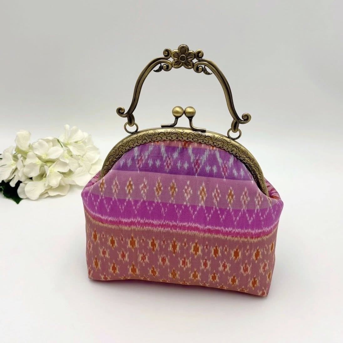 กระเป๋าผ้าไหมสีกะปิชมพู ใบกลางหูดอกไม้