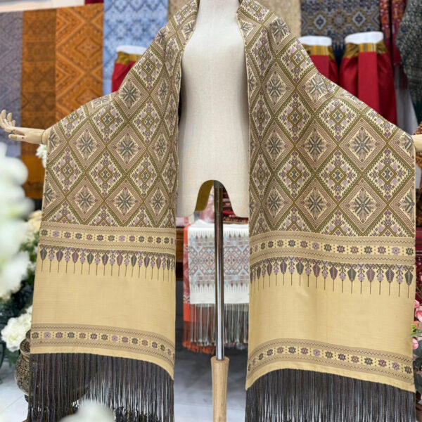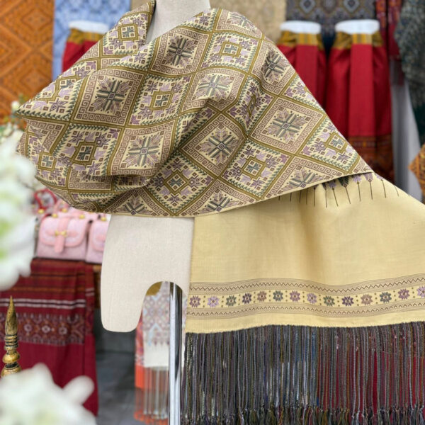 -ผ้าที่จกเกาะรอบเดียวด้วยไหมสี่เส้น -ผ้าคุมไหล่หรือคล้องคอไหมแพรวา