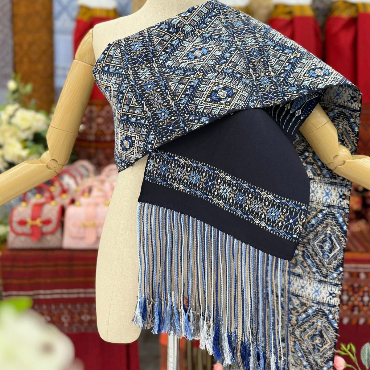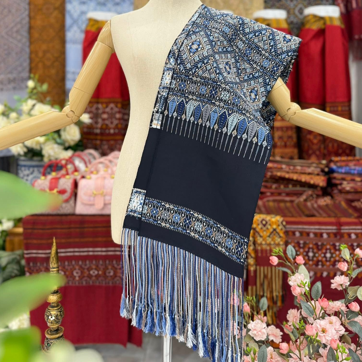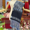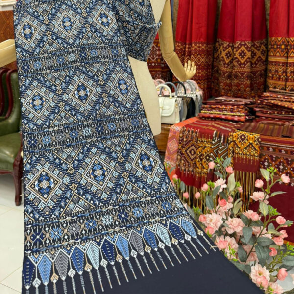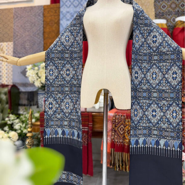 ผ้าสไบไหมแพรวาทอพิเศษลายต่อเนื่องโทนสีกรมคราม