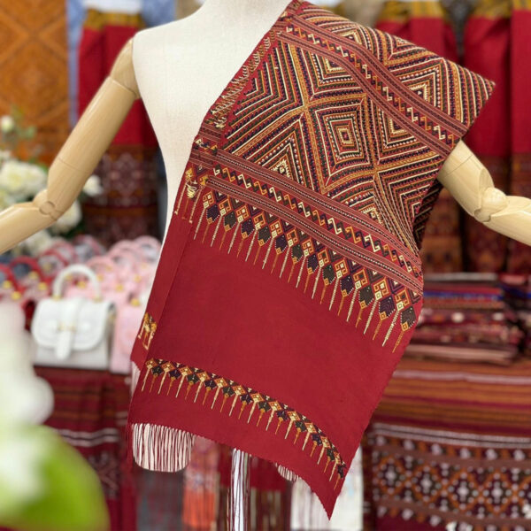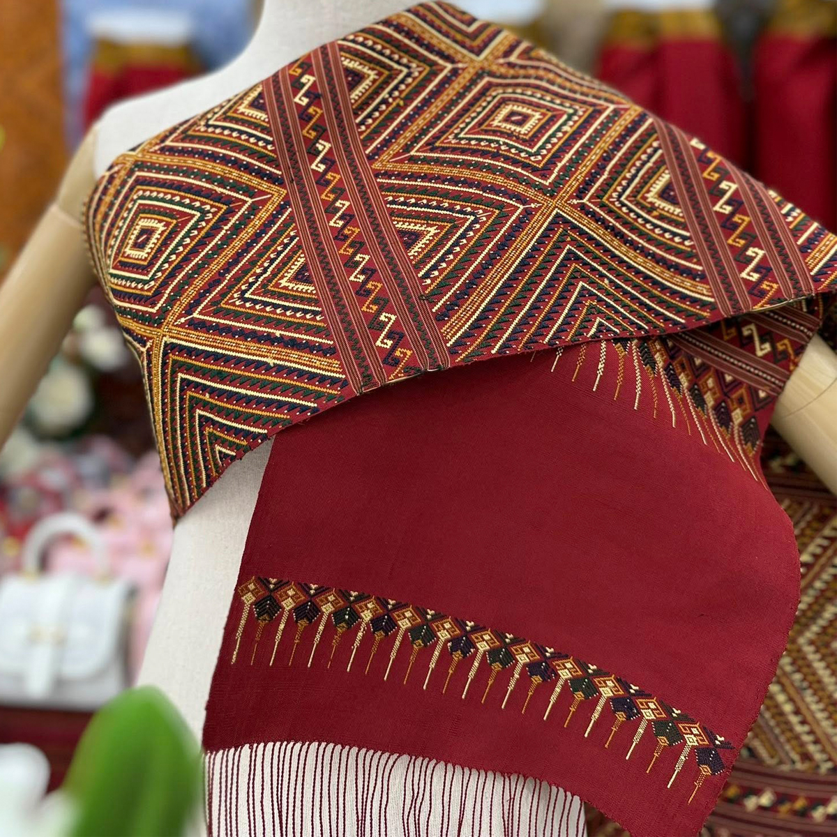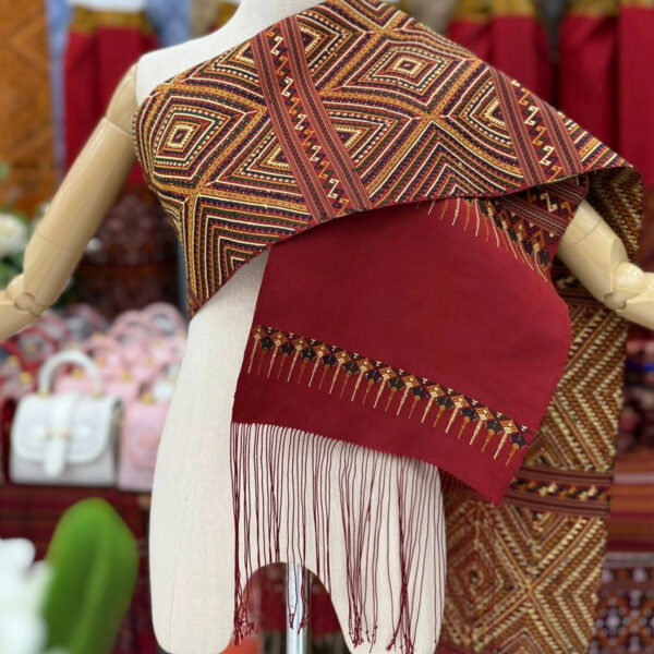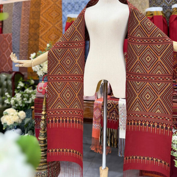ผ้าสไบไหมแพรวาทอลายกาบแบบโบราณโทนสีแดง
