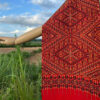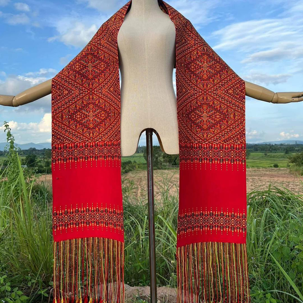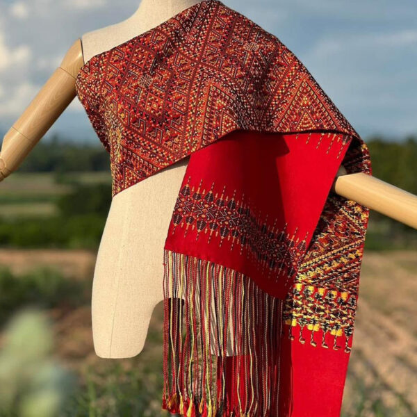 ผ้าสไบไหมแพรวาทอลายพิเศษแบบโบราณโทนสีแดงสด